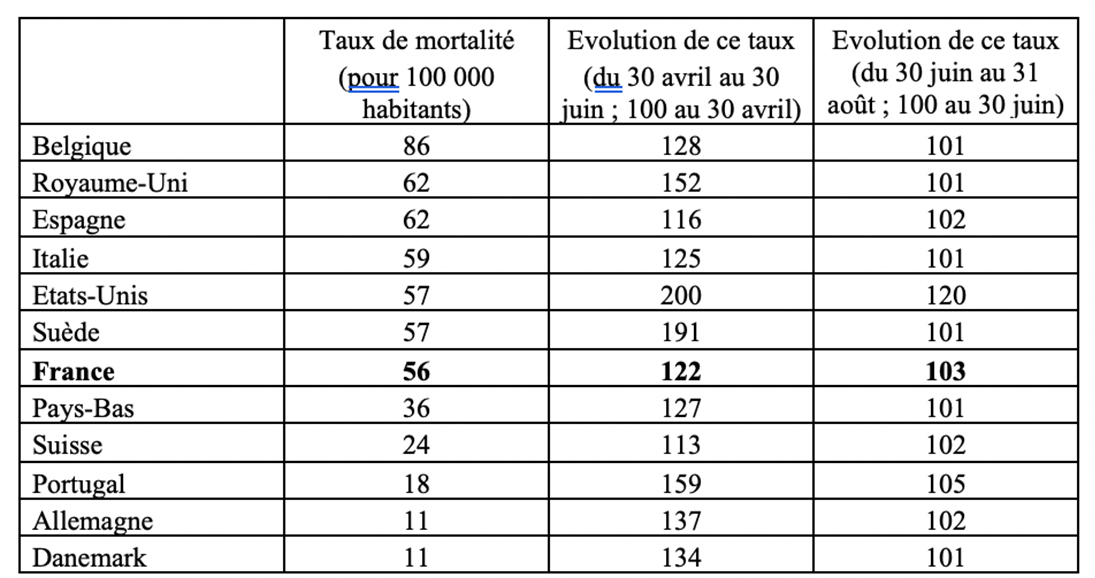 Rapporté à la population française, cela représente 56 décès pour 100 000 habitants. Ce taux permet une comparaison avec les autres grands pays (première colonne du tableau 1). Les deux autres colonnes du tableau mesurent l’évolution de l’épidémie au cours du printemps puis de l’été dans ces mêmes pays.